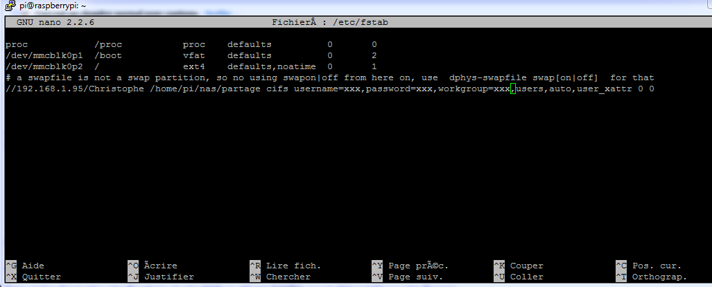 //192.168.1.95/Christophe /home/pi/nas/partage cifs username=login,password=motdepasse,workgroup=groupe,users,auto,user_xattr 0 0