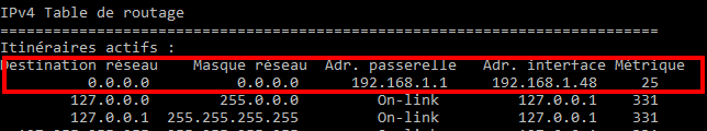 Taper la commande route print.